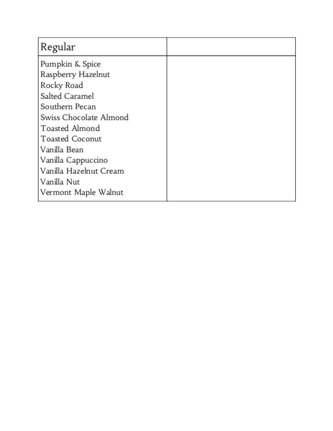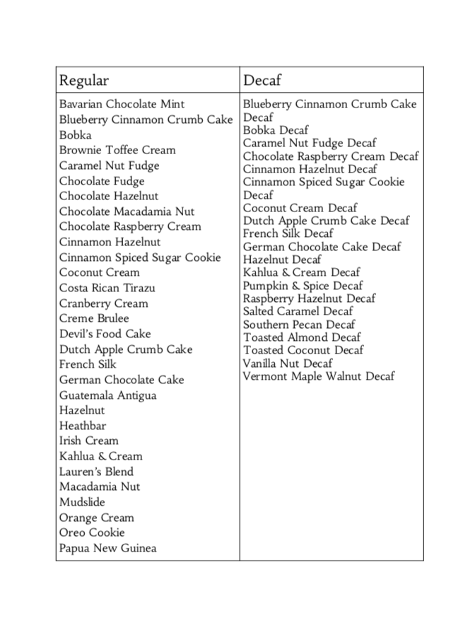 The menu at Kevin's Coffee Roasters offers a delightful array of flavors to suit various tastes. For regular coffee lovers, there are options like Pumpkin & Spice, Raspberry Hazelnut, Rocky Road, Salted Caramel, and Southern Pecan-each with a distinct and comforting taste. For those who prefer decaffeinated options, the menu features Blueberry Cinnamon Crumb Cake Decaf, Bobka Decaf, Caramel Nut Fudge Decaf, Chocolate Raspberry Cream Decaf, and Cinnamon Hazelnut Decaf, providing a rich flavor without the caffeine. Whether you’re in the mood for something sweet and spicy or a more indulgent treat, Kevin's Coffee Roasters has something to satisfy every palate.